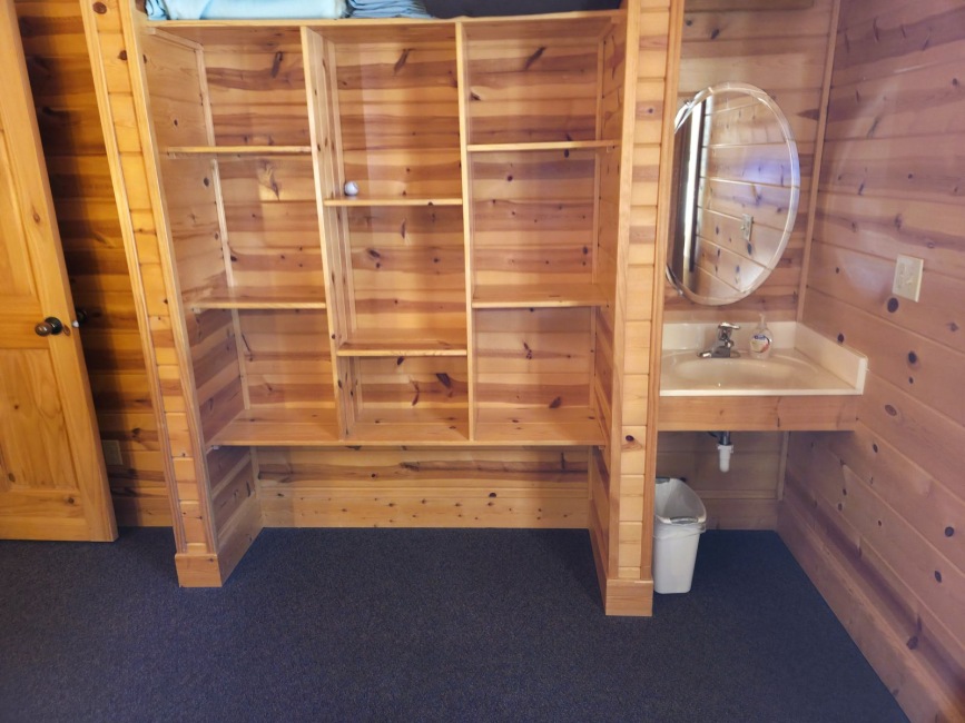 - All bedrooms have a sink (hand soap is provided), shelving storage and bedding